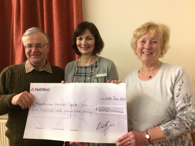 A cheque for £600 was presented to Macmillan fund-raising volunteer, Tracy Townend pictured here with choir Chairman, John Thurstan and Secretary Nerys Mansell.